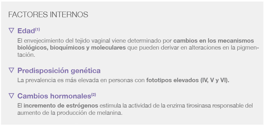 En l’àrea genitoperineal i zones adjacents hi ha un procés d’envelliment igual que ocorre en la resta de l’organisme. A causa d’això, es pot observar no només una pèrdua d’elasticitat i fermesa sinó també un canvi de color de la zona.